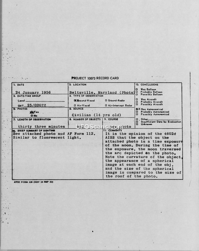 Project 10073 Record Card — Beltsville, Maryland, 24 January 1956