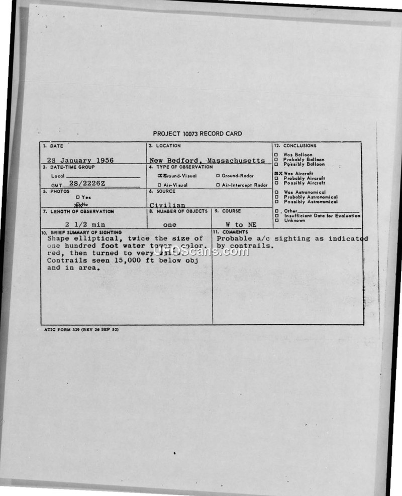 A civilian in New Bedford, Massachusetts, reported an elliptical object on January 28, 1956. Military authorities concluded the object was likely an aircraft based on the observation of contrails.