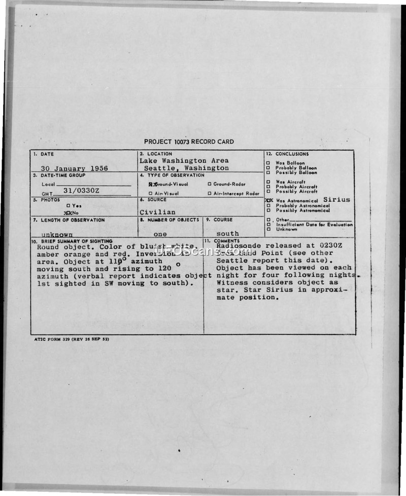 An investigation into a UFO sighting in Seattle, Washington, concluded that the object observed was the star Sirius. The report includes witness statements, astronomical data, and results from military intercept efforts.