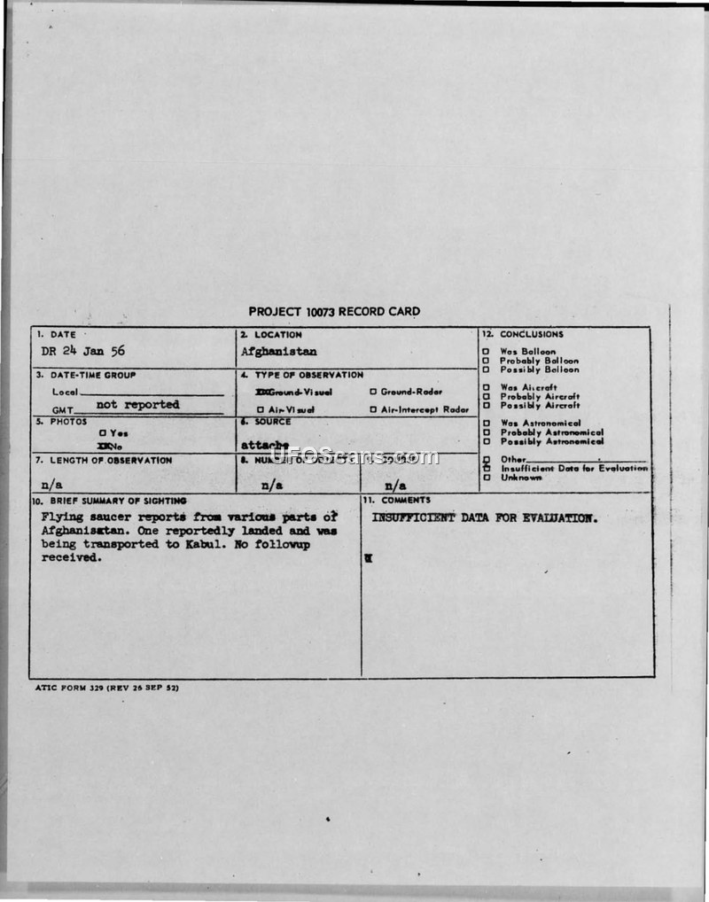 Project 10073 Record Card and Related Correspondence — Afghanistan, January 1956