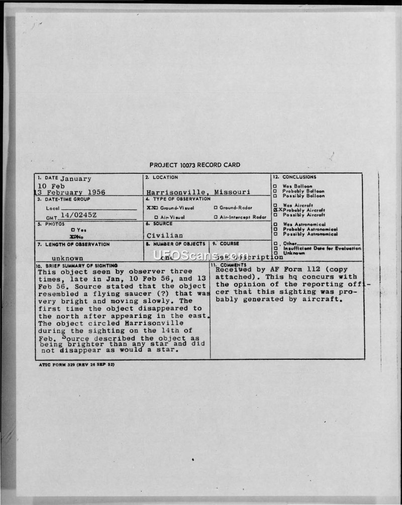 A civilian witness reported a bright, slow-moving object over Harrisonville, Missouri, on three occasions in early 1956. The Air Force concluded the sightings were likely caused by conventional aircraft.
