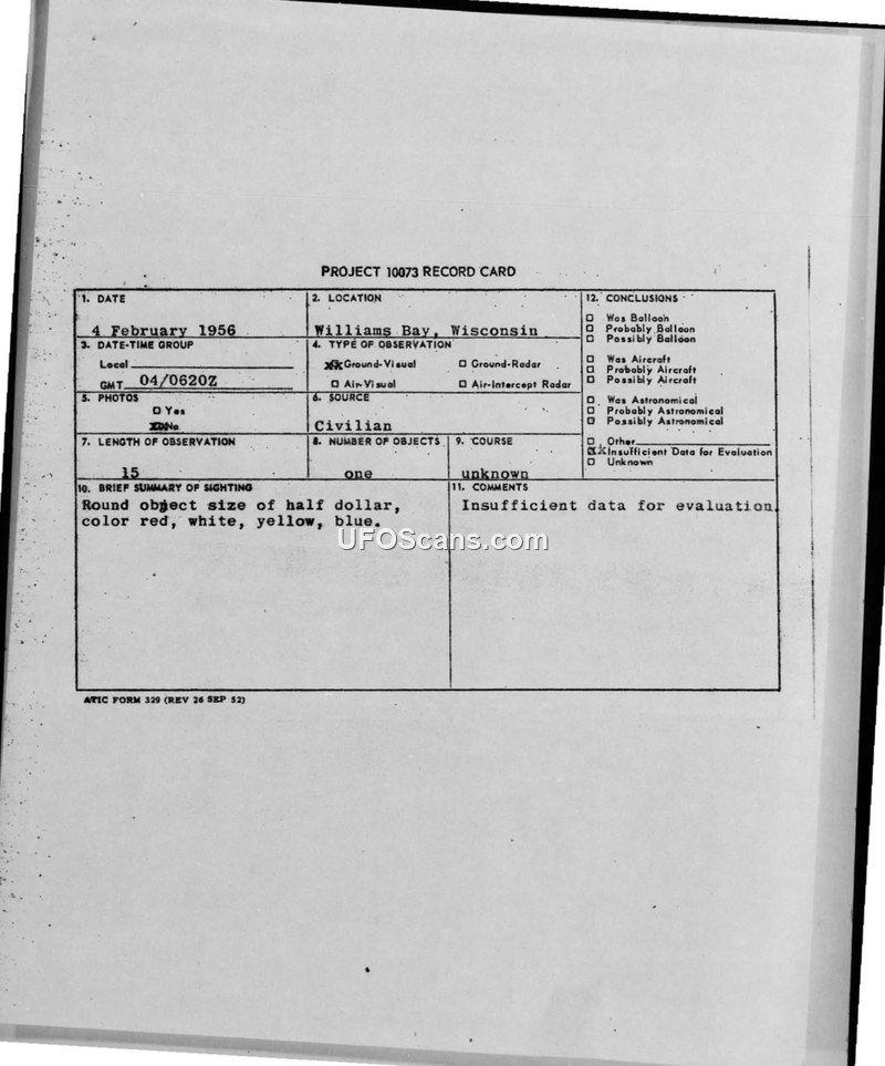 Project 10073 Record Card — Williams Bay, Wisconsin, 4 February 1956