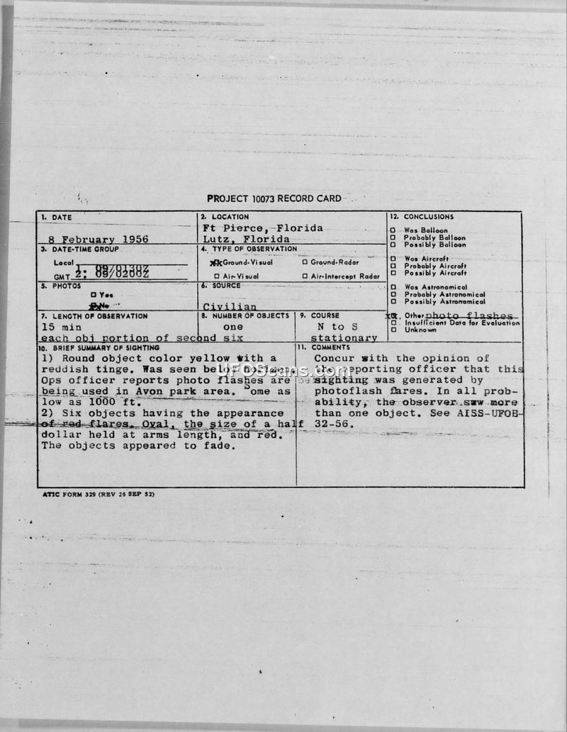 Project 10073 Record Card and Incident Report — Ft. Pierce and Lutz, Florida, February 1956