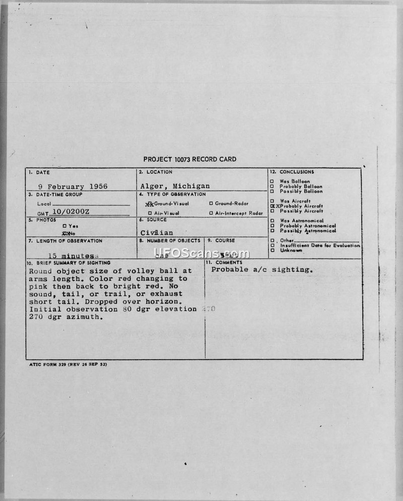 Project 10073 Record Card — Alger, Michigan, 9 February 1956