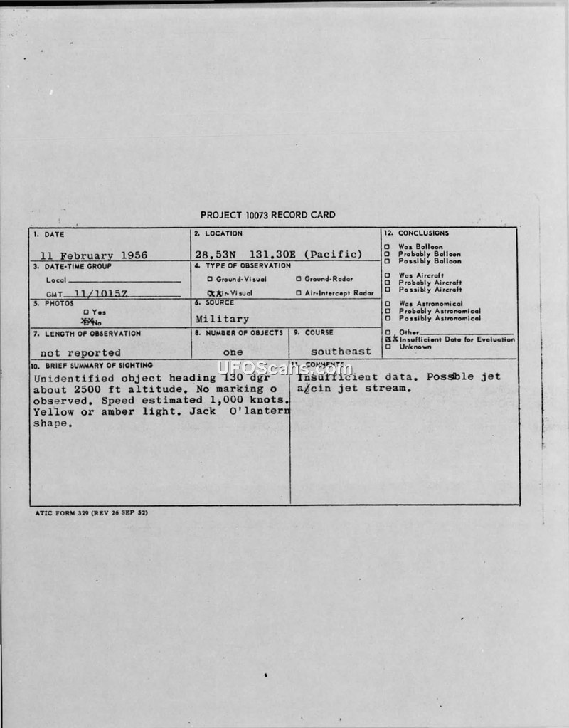 This document consists of a Project 10073 record card and associated military communications regarding an unidentified flying object sighting on 11 February 1956. The incident occurred in the Pacific at coordinates 28.53N 131.30E. A MATS C-124 crew reported observing a single object at an altitude of approximately 2,500 feet, traveling on a heading of 130 degrees at an estimated speed of 1,000 knots. The object was described as a yellow or amber light with a 'jack-o'-lantern' shape, and no markings were observed. The report was transmitted through military channels, including FEAF and the 64th Air Division, to the Air Technical Intelligence Center (ATIC) at Wright-Patterson AFB. Subsequent communications indicate that no further information was received by headquarters that would allow for correlation with any known aircraft. The official conclusion recorded on the project card is that there was insufficient data for evaluation, with a note suggesting the possibility of a jet stream. The document includes administrative markings indicating it was later downgraded and declassified.