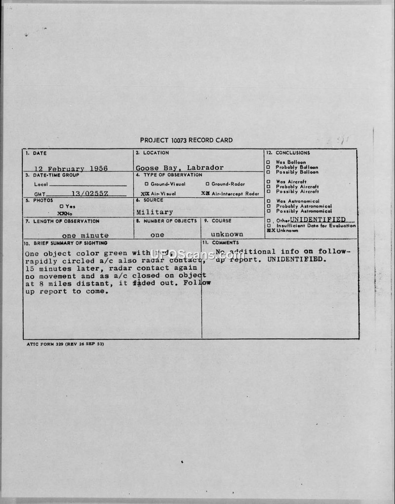 This document collection contains records and correspondence regarding two separate aerial sighting incidents near Goose Bay, Labrador, in February 1956. The first incident, occurring on February 12, 1956, involved a single object described as green with red lights that rapidly circled a military aircraft. The object was tracked by both the aircraft's radar and ground controllers. Notably, the radar contact faded when the intercepting aircraft closed to within eight miles of the object. The second incident, on February 18, 1956, involved a KC-97 aircraft (Sideburn 11) reporting an object that appeared to be another aircraft with lights that disappeared when the commander requested identification. The documentation includes Project 10073 record cards for both events. The February 12th sighting was classified as 'Unidentified' in the initial record card, but subsequent correspondence from the Foreign Technology Division in 1965 dismissed the report as too incomplete for a formal evaluation. The electronics engineer reviewing the case noted that the reported behavior—where the radar target faded as the interceptor approached—was illogical, as a genuine target should typically become stronger as the distance decreases. The documents also include internal military communications, such as a CIRVIS report, detailing the coordinates and weather conditions during the sightings. The records reflect the military's attempt to categorize these events, with the final assessment for the February 18th incident being that it was an aircraft sighting rather than a UFO. The collection highlights the procedural challenges in investigating UAP reports during the mid-1950s, particularly when radar data was inconsistent or incomplete.
