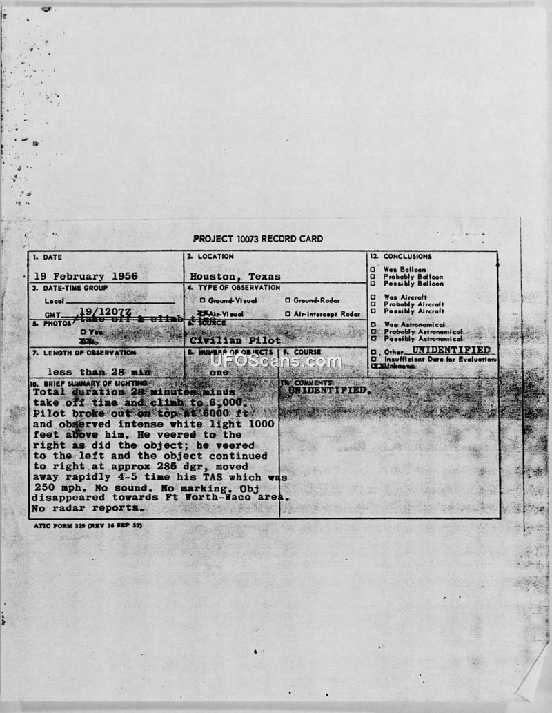 Project 10073 Record Card — Houston, Texas, 19 February 1956