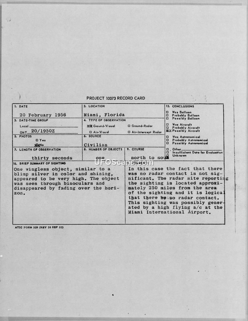 Project 10073 Record Card — Miami, Florida, 20 February 1956