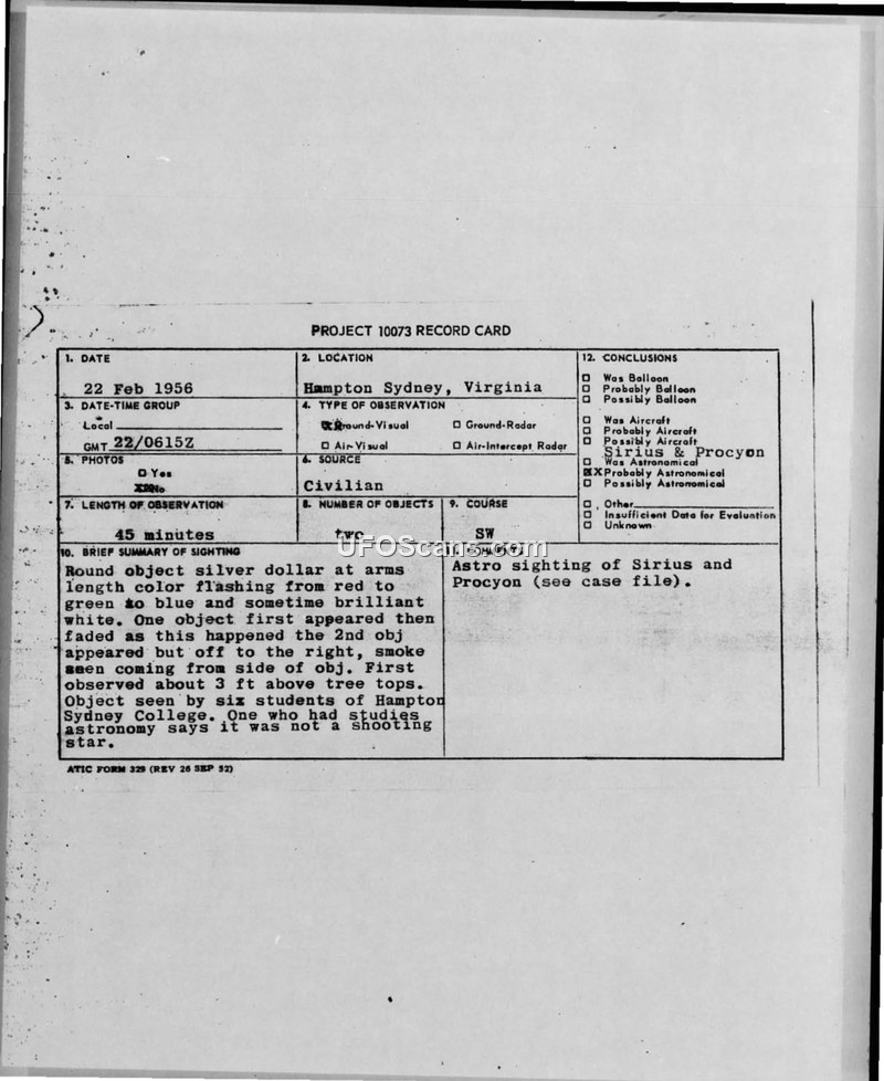 Students at Hampton-Sydney College reported a multi-colored, oscillating object in the sky on February 22, 1956. Air Force investigators concluded the sighting was a misidentification of the stars Sirius and Procyon caused by atmospheric scintillation and improper telescope focus.