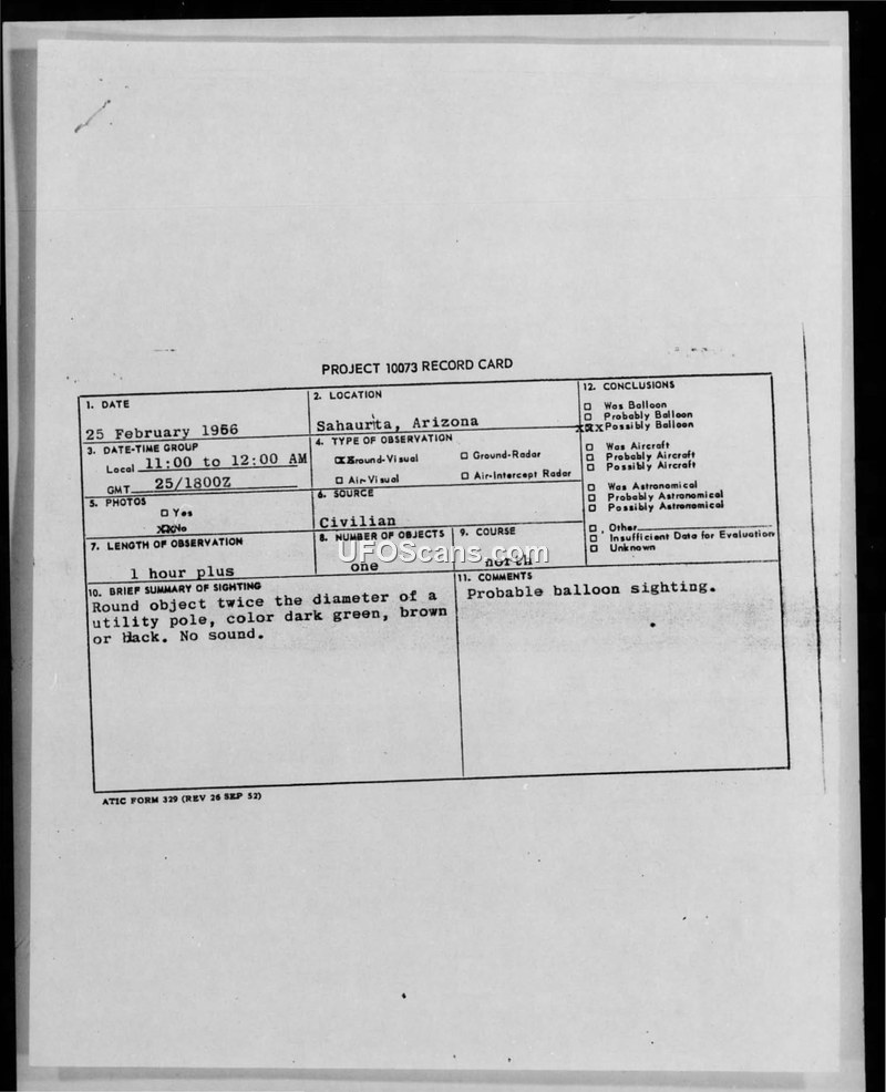 This document file contains the records and correspondence related to a UFO sighting reported on February 25, 1956, near Sahuarita, Arizona. The primary witness, a civilian, reported observing a spherical object for over an hour. The witness described the object as being twice the diameter of a utility pole, colored dark green, brown, or black, and noted that it hovered over the desert, descended toward the ground, and then rose again. The witness, who was traveling with their spouse, observed the object through binoculars and reported it to the Davis-Monthan Air Force Base, though they felt their report was met with disinterest. The witness later provided a detailed technical information sheet, including a sketch of the object and the surrounding area, and expressed a firm belief that the object was tangible and not a hallucination, airplane, or balloon. The 4602d Air Intelligence Service Squadron (AISS) initiated an investigation, assigning the case to Project 10073. The AISS attempted to correlate the sighting with known balloon flights, specifically contacting the Air Force Cambridge Research Center regarding balloon launches from Vernalis NAAS. Despite extensive correspondence between the 4602d AISS and the Air Force Cambridge Research Center, investigators were unable to confirm the presence of any balloons in the area at the time of the sighting. Major R.H. Braun of the Atmospheric Devices Laboratory eventually reported that available records for balloon flights I-2 and I-5 did not account for the reported object. Consequently, while the official conclusion on the record card was listed as 'Possible Balloon,' the internal correspondence highlights the lack of evidence to substantiate this claim, with the 4602d AISS explicitly stating that there was no evidence a balloon was in the area.