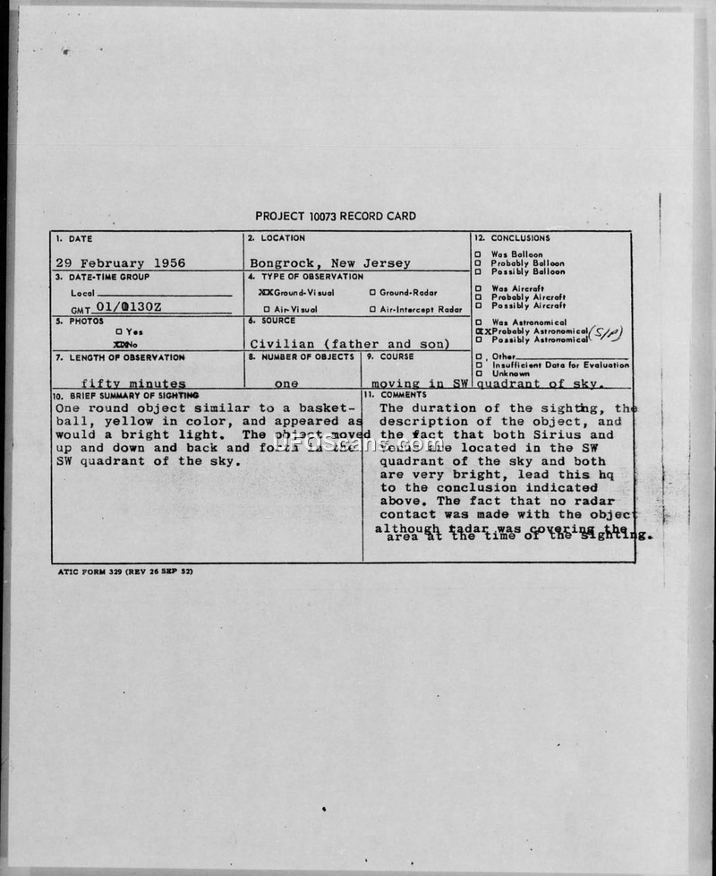 PROJECT 10073 RECORD CARD — Bongrock, New Jersey, 29 February 1956