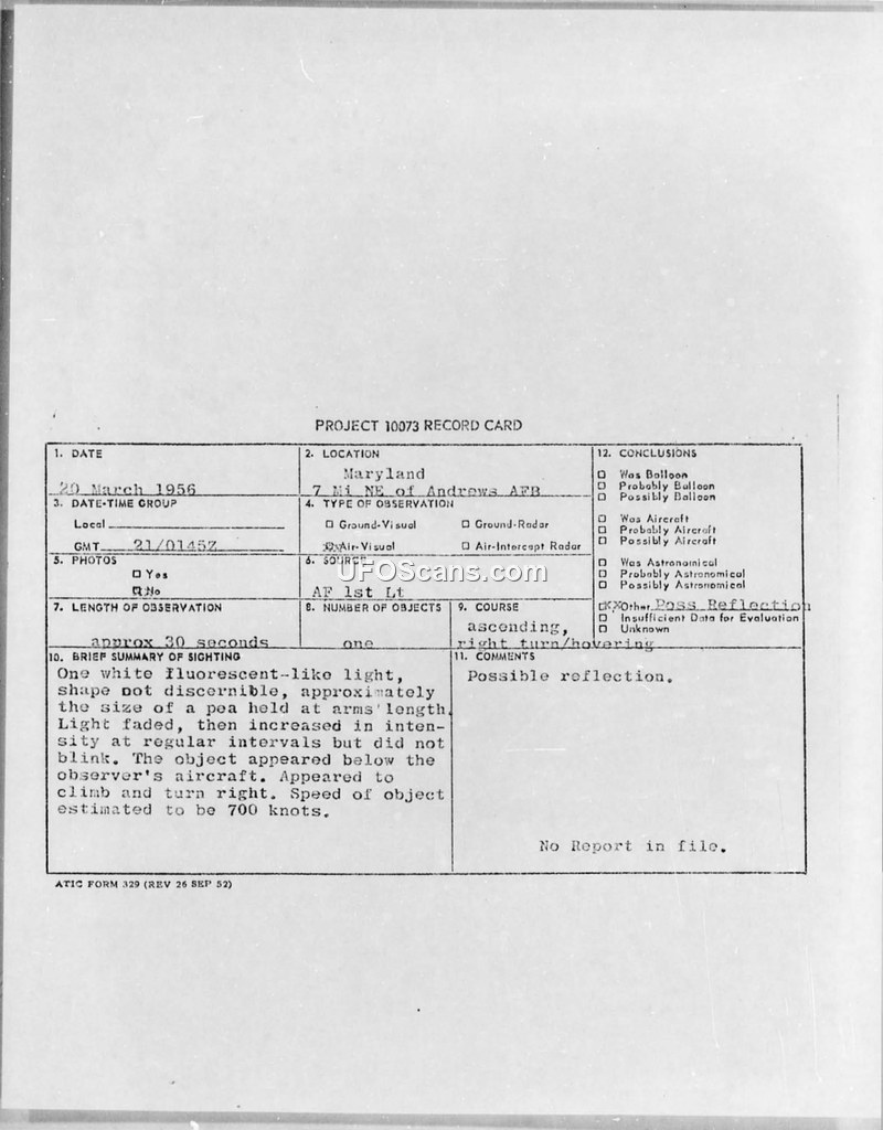 This document is a Project 10073 Record Card detailing an unidentified aerial phenomenon sighting that occurred on March 20, 1956, at 0145Z. The witness, an Air Force First Lieutenant, reported observing a single object seven miles northeast of Andrews Air Force Base in Maryland. The object was described as a white, fluorescent-like light with a shape that was not discernible. The witness estimated the size of the object to be equivalent to a pea held at arm's length. During the approximately 30-second observation, the light was observed to fade and then increase in intensity at regular intervals, though it did not blink. The object was positioned below the observer's aircraft and was seen to climb and turn to the right. The speed of the object was estimated at 700 knots. The flight path was noted as ascending with a right turn or hovering behavior. The record indicates that no photographs were taken and there was no radar contact. The final conclusion recorded on the card is that the sighting was a 'Possible reflection.' A note at the bottom of the card states that there is no further report in the file.