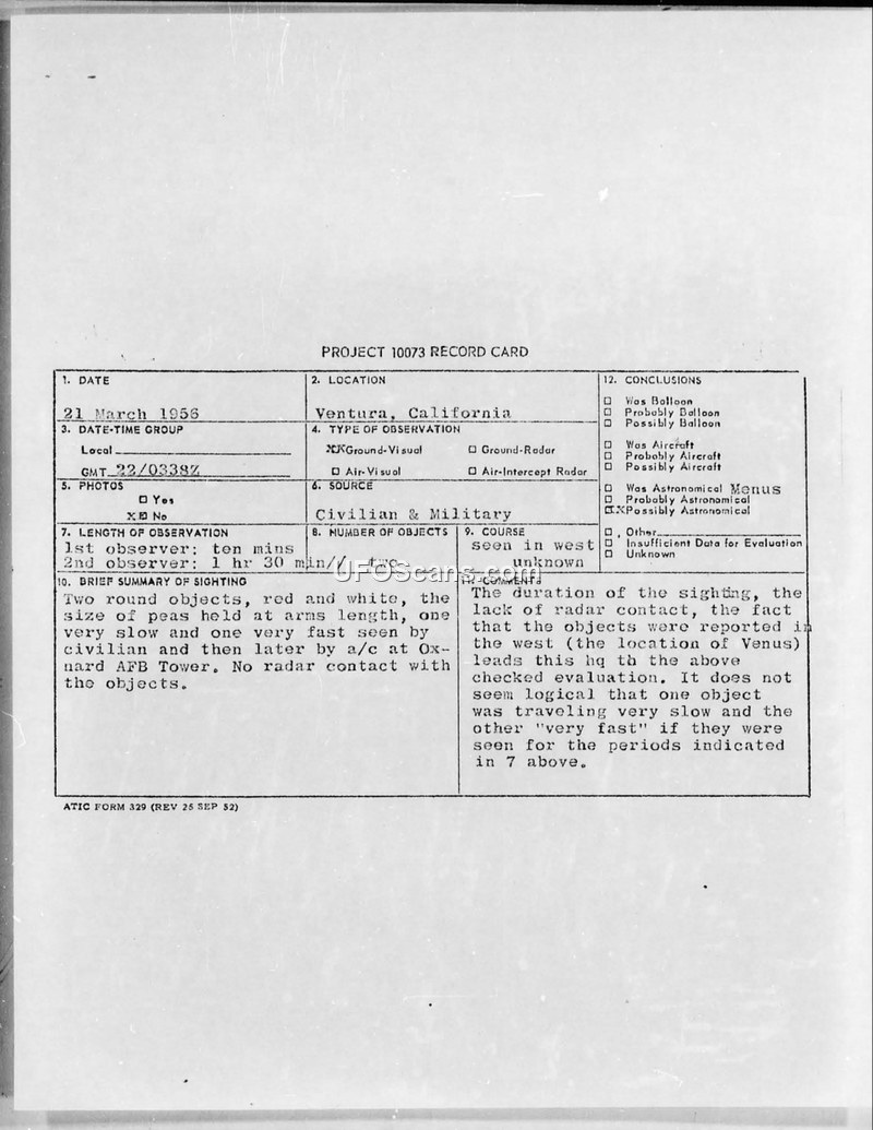 Project 10073 Record Card — Ventura, California, 21 March 1956