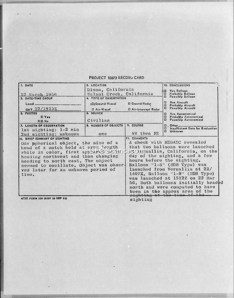 PROJECT 10073 RECORD CARD - 22 March 1956 - Dixon, California