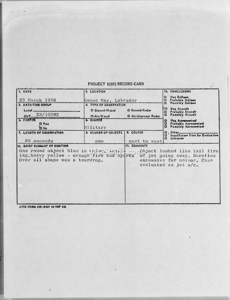 Project 10073 Record Card — Goose Bay, Labrador, 23 March 1956