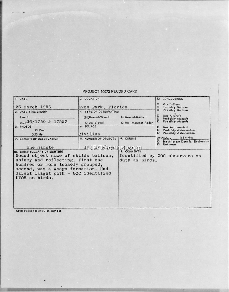 On March 26, 1956, civilian observers in Avon Park, Florida, reported a formation of over 100 shiny, round objects. The Ground Observer Corps (GOC) officially identified the objects as birds.