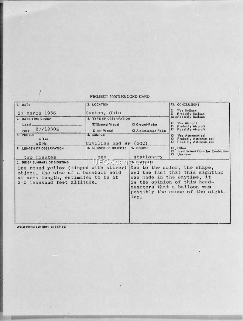 PROJECT 10073 RECORD CARD - Canton, Ohio - 27 March 1956