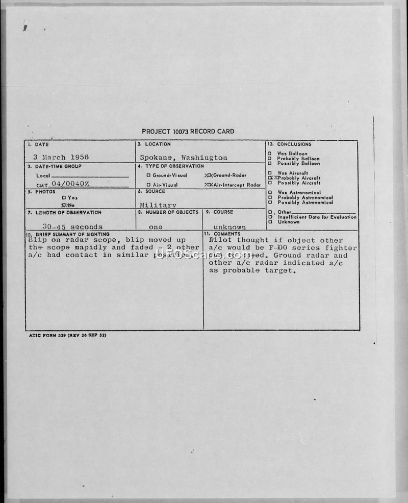 Project 10073 Record Card — Spokane, Washington, 3 March 1956