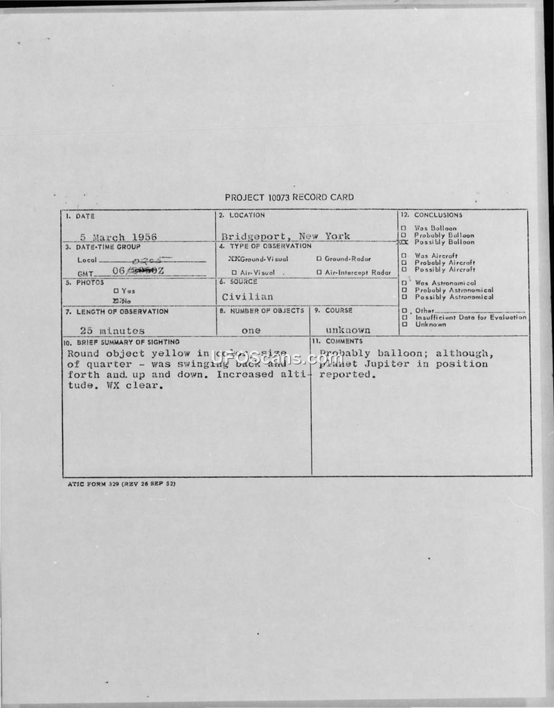 This report documents a March 1956 UFO sighting in Bridgeport, New York, by two witnesses. Investigators concluded the object was likely an illuminated weather balloon based on wind data and the lack of radar confirmation.