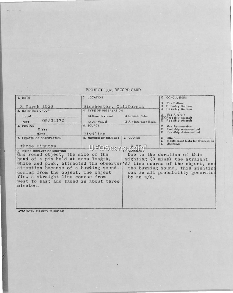 PROJECT 10073 RECORD CARD — 8 March 1956, Winchester, California