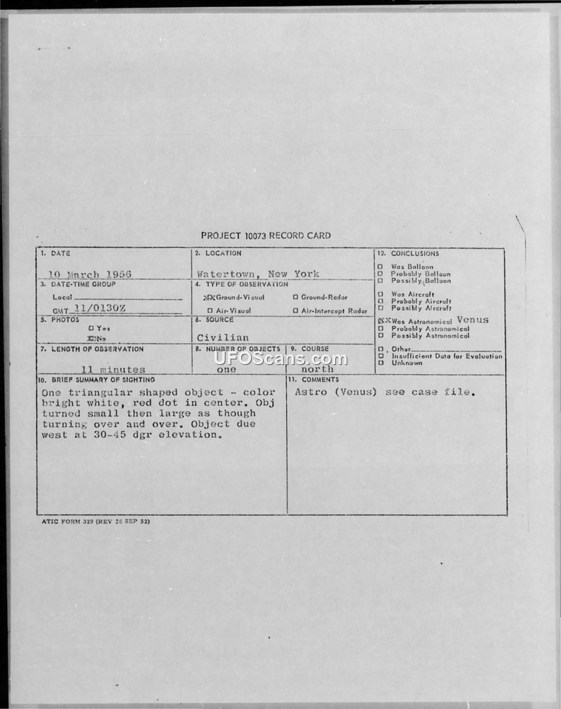 An investigation into a March 1956 UFO sighting in Watertown, New York, concluded that the object was the planet Venus. The report includes witness statements, sketches, and corroborating data from local radar and astronomical experts.