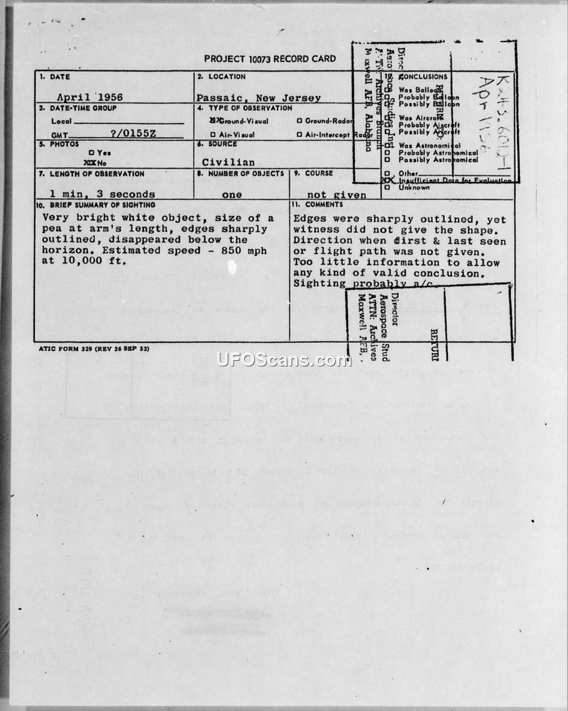 A 1956 sighting report from Passaic, New Jersey, involving a bright white object observed by a student. The Air Technical Intelligence Center concluded that insufficient data prevented a definitive identification.
