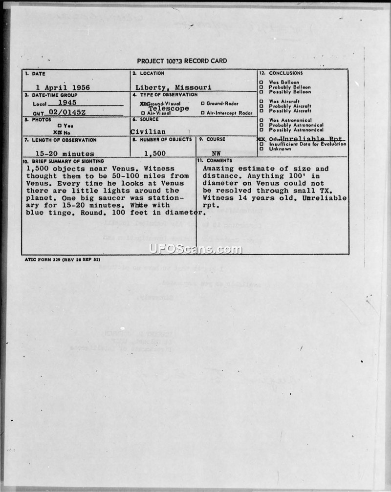 A 14-year-old witness reported seeing 1,500 objects near Venus on April 1, 1956. The Air Technical Intelligence Center classified the report as an unreliable sighting.