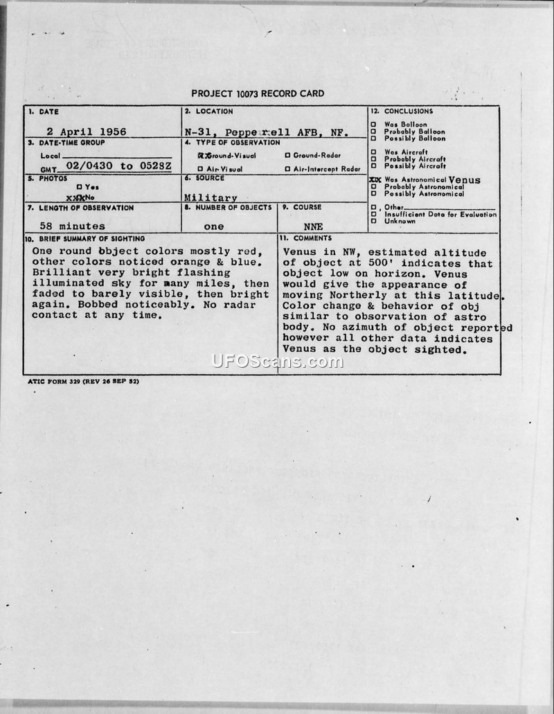 Project 10073 Record Card — N-31, Pepperrell AFB, NF, 2 April 1956