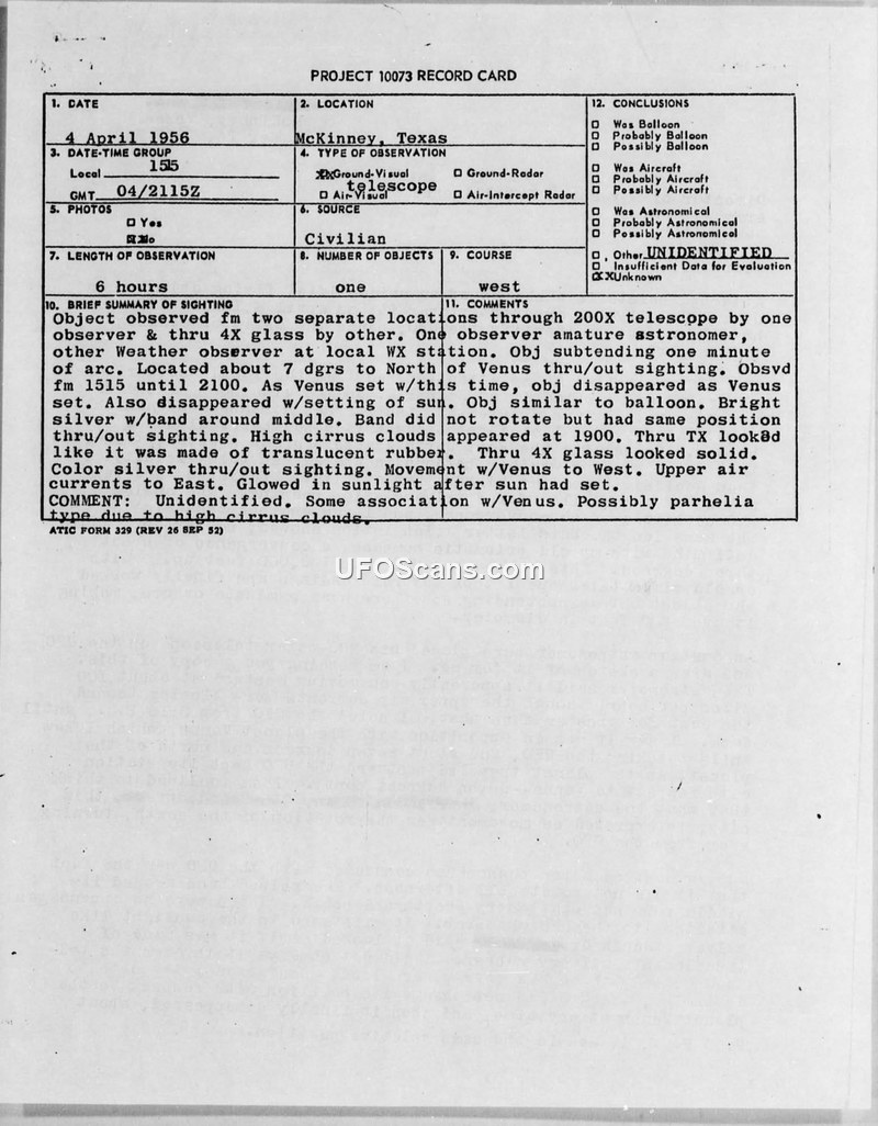 This document consists of a series of reports and record cards regarding Unidentified Aerial Phenomena (UAP) observed in McKinney, Texas, in April 1956. The primary report is a letter dated May 14, 1956, from Captain Roy F. Hall (Retd.), a local Weather Bureau observer, to the Director of Air Force Intelligence. Captain Hall details a sighting on April 4, 1956, where he and an amateur astronomer observed a large, stationary, silvery object through telescopes. The object, estimated to be over 200 feet in diameter and at an altitude of 100,000 feet, maintained a fixed position relative to the planet Venus for several hours before disappearing at sunset. Hall notes the object had a raised band around its middle, did not rotate, and appeared to be made of translucent, silvery rubber. He explicitly rules out weather balloons after contacting the Fort Worth Weather Bureau. The document also includes reports of two subsequent incidents. On April 6, 1956, witnesses reported a smaller, five-to-eight-foot silvery object that descended into a field before taking off at high speed. On April 13, 1956, Captain Hall observed two red lights moving at high speed, while another witness reported three pale blue lights. The Air Force Project 10073 record cards categorize the April 4 sighting as 'Unknown' and the April 13 sighting as a 'possible meteor.' The document includes sketches of the April 4 object, which show a distinct, band-like structure. Captain Hall emphasizes his skepticism regarding 'flying saucers' but provides the data for official review.