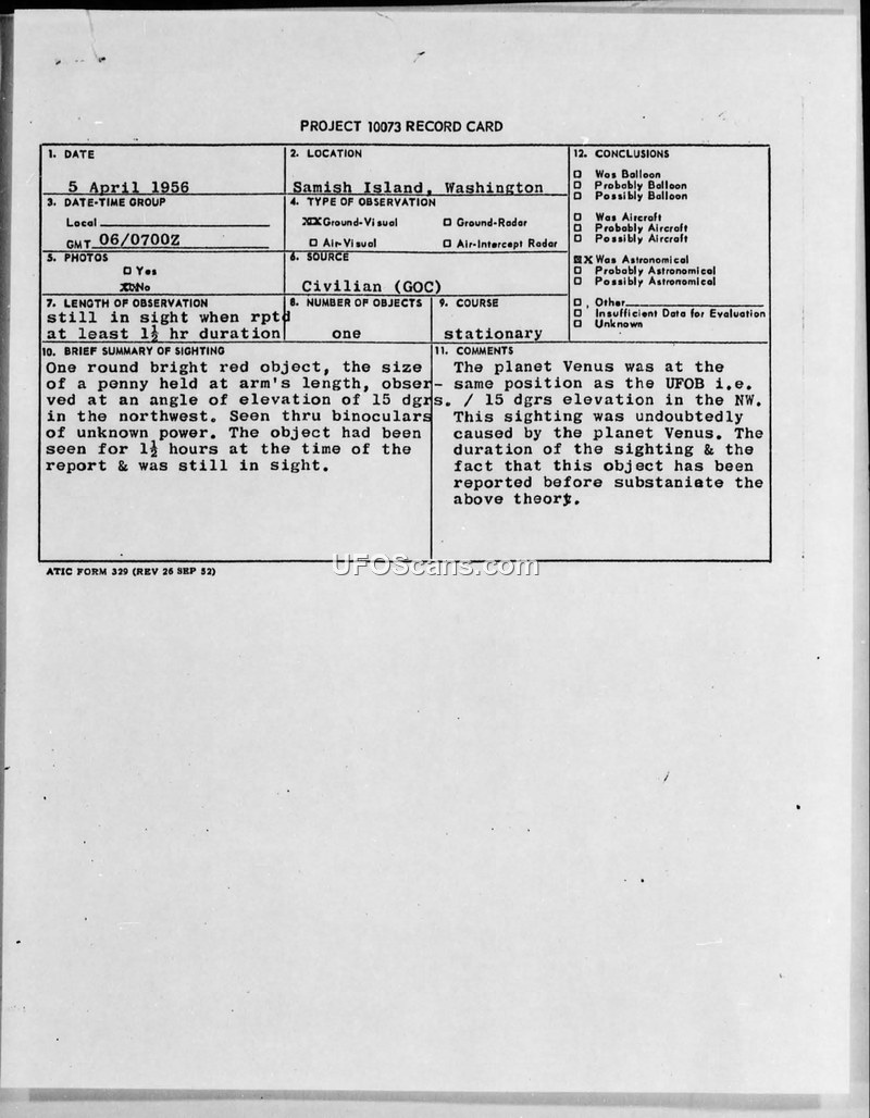 PROJECT 10073 RECORD CARD — Samish Island, Washington, 5 April 1956