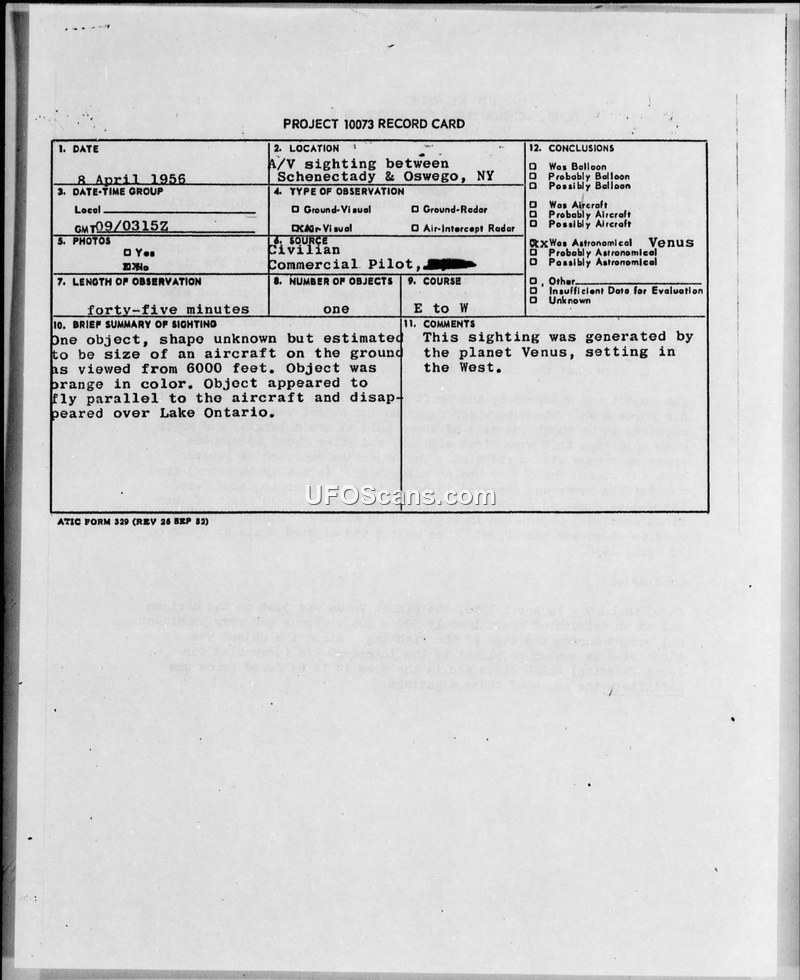 Project 10073 Record Card: Sighting between Schenectady and Oswego, NY, 8 April 1956