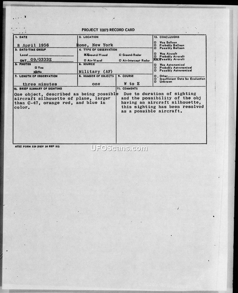 Project 10073 Record Card — Rome, New York, 8 April 1956