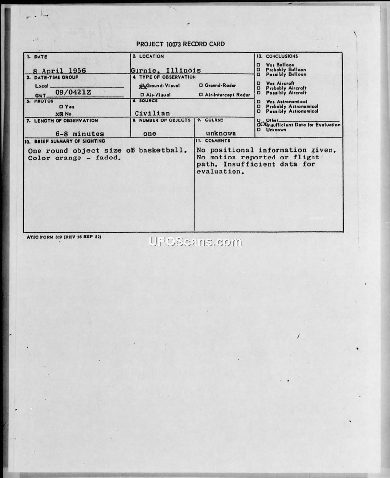 Project 10073 Record Card — Gurnie, Illinois, 8 April 1956