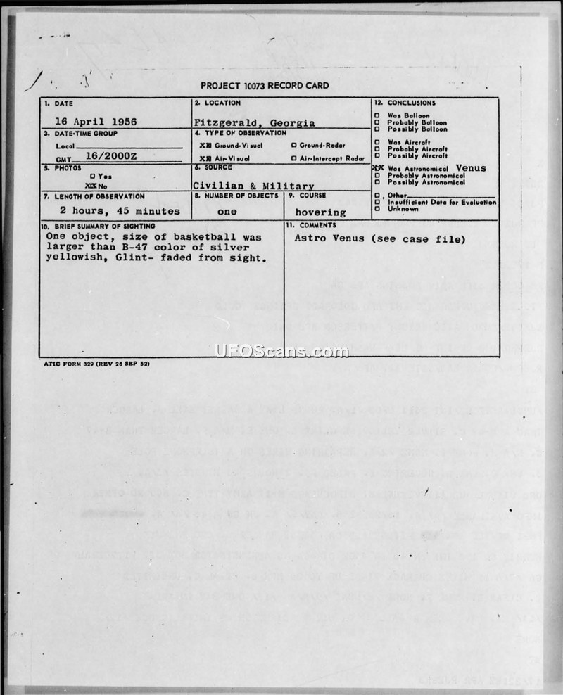 Project 10073 Record Card and Air Intelligence Information Report — Fitzgerald, Georgia, 16 April 1956
