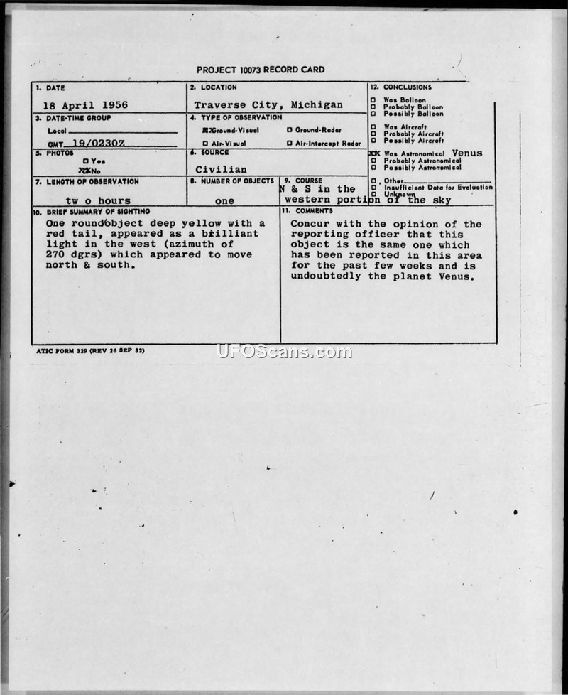 On 18 April 1956, a sighting of an unidentified aerial object was reported in Traverse City, Michigan, by Mr. and Mrs. Mlujea. The witnesses observed a round, deep yellow object with a red tail, described as a brilliant light, positioned at an azimuth of 270 degrees. The object was observed for a duration of two hours and appeared to move north and south. The report was processed by the 752nd AC&W Squadron and forwarded to the Air Tech Intelligence Center at Wright-Patterson Air Force Base. Official evaluation concluded that the object was the planet Venus, noting that similar reports had been filed in the area over the preceding weeks. The investigation determined that the object typically becomes visible after dark and slowly dips toward the western horizon, consistent with the behavior of the planet Venus.