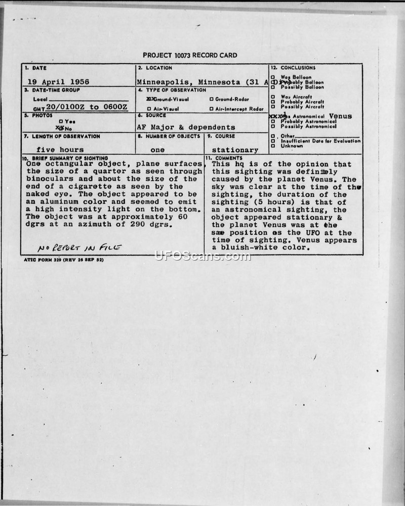 A sighting of a stationary, octangular object in Minneapolis on 19 April 1956 was investigated by the Air Force under Project 10073. The object was officially identified as the planet Venus.