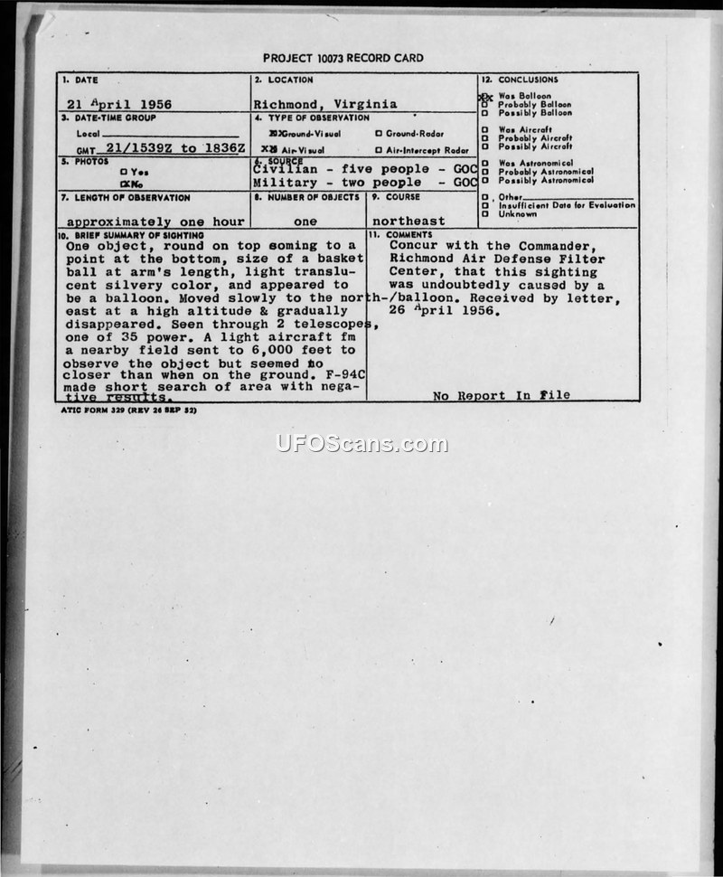 On April 21, 1956, a sighting occurred in Richmond, Virginia, involving a single object observed by five civilians and two military personnel associated with the Ground Observer Corps (GOC). The observation lasted approximately one hour, between 1539Z and 1836Z. Witnesses described the object as round on top, tapering to a point at the bottom, and roughly the size of a basketball when held at arm's length. It was noted for its light, translucent, silvery appearance. The object moved slowly toward the northeast at a high altitude before eventually disappearing. The witnesses utilized two telescopes, one of which had 35-power magnification, to observe the object. In response to the sighting, a light aircraft was dispatched from a nearby field to an altitude of 6,000 feet to investigate; however, the pilot reported that the object appeared no closer than it did from the ground. Additionally, an F-94 aircraft conducted a search of the area, which yielded negative results. The Richmond Air Defense Filter Center evaluated the incident and concluded that the sighting was undoubtedly caused by a balloon. This determination was documented in a letter received on April 26, 1956.
