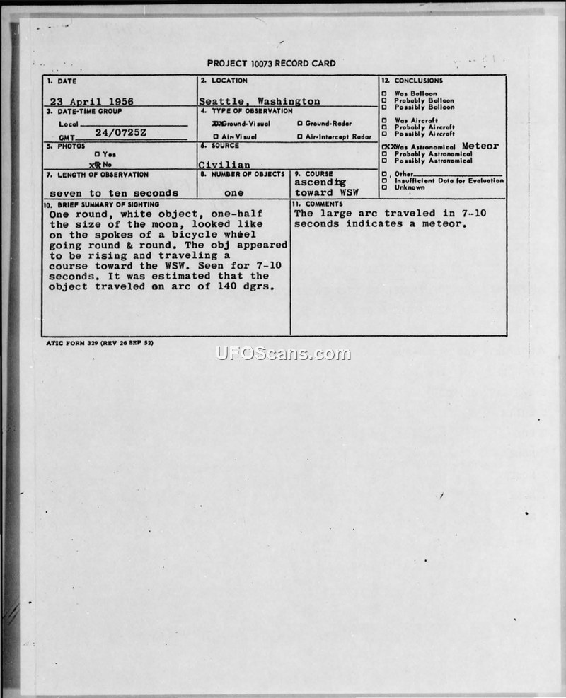 A 23-year-old Boeing draftsman reported a round, white object in Seattle on April 23, 1956. The military investigation concluded the sighting was a meteor.