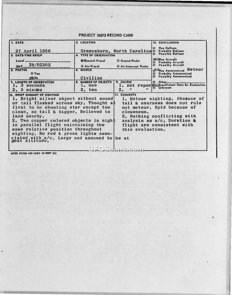 PROJECT 10073 RECORD CARD — Greensboro, North Carolina, 27 April 1956