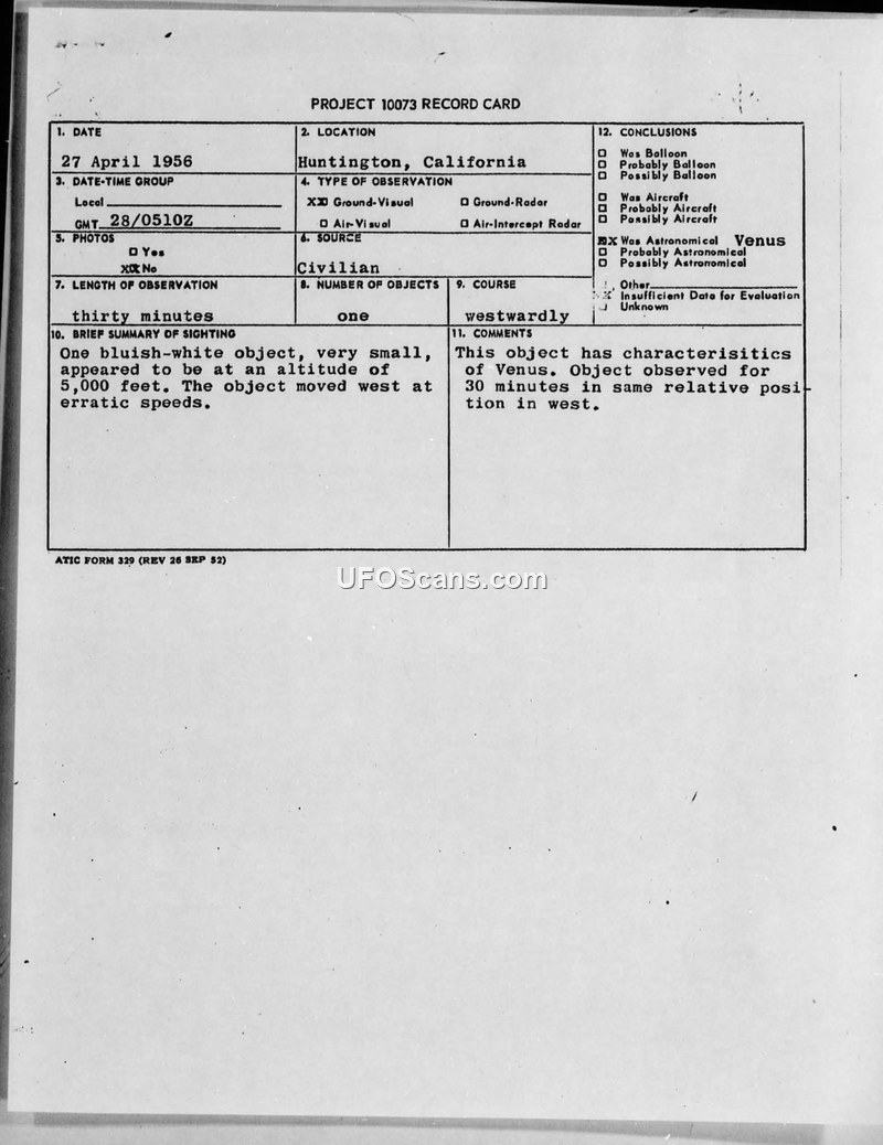 Project 10073 Record Card — Huntington, California, 27 April 1956