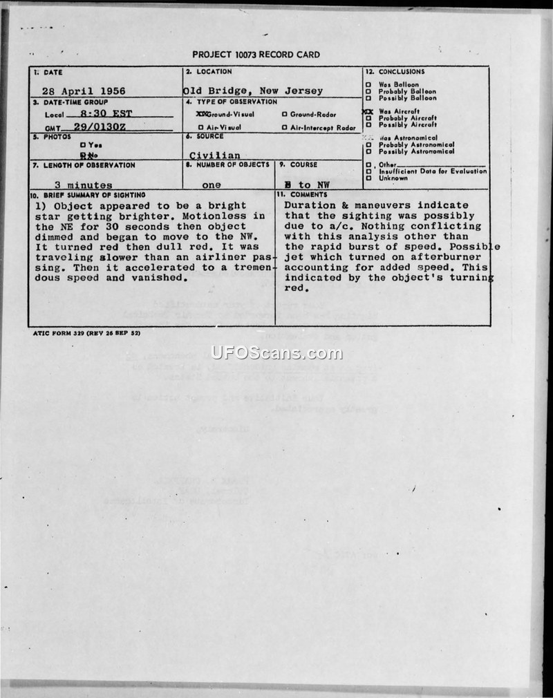 A former aviation consultant reported a bright, maneuvering aerial object over Old Bridge, New Jersey, in April 1956. The Air Technical Intelligence Center concluded the object was likely a jet aircraft using an afterburner.