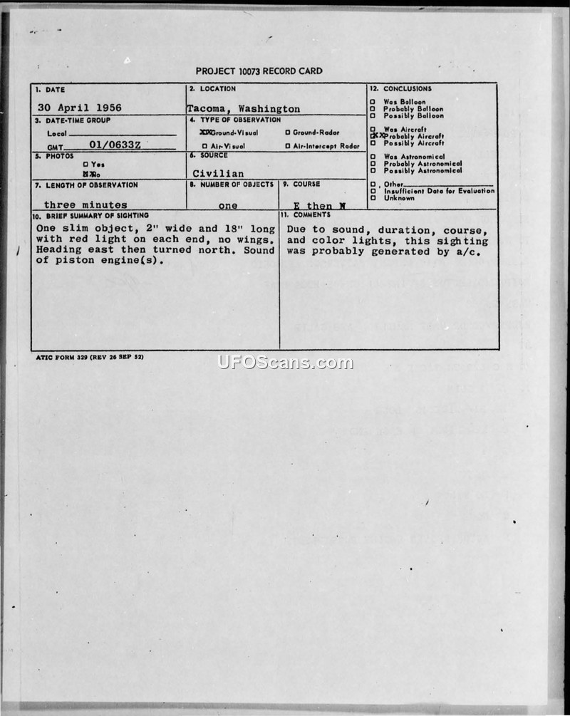Project 10073 Record Card and Sighting Summaries, April 1956