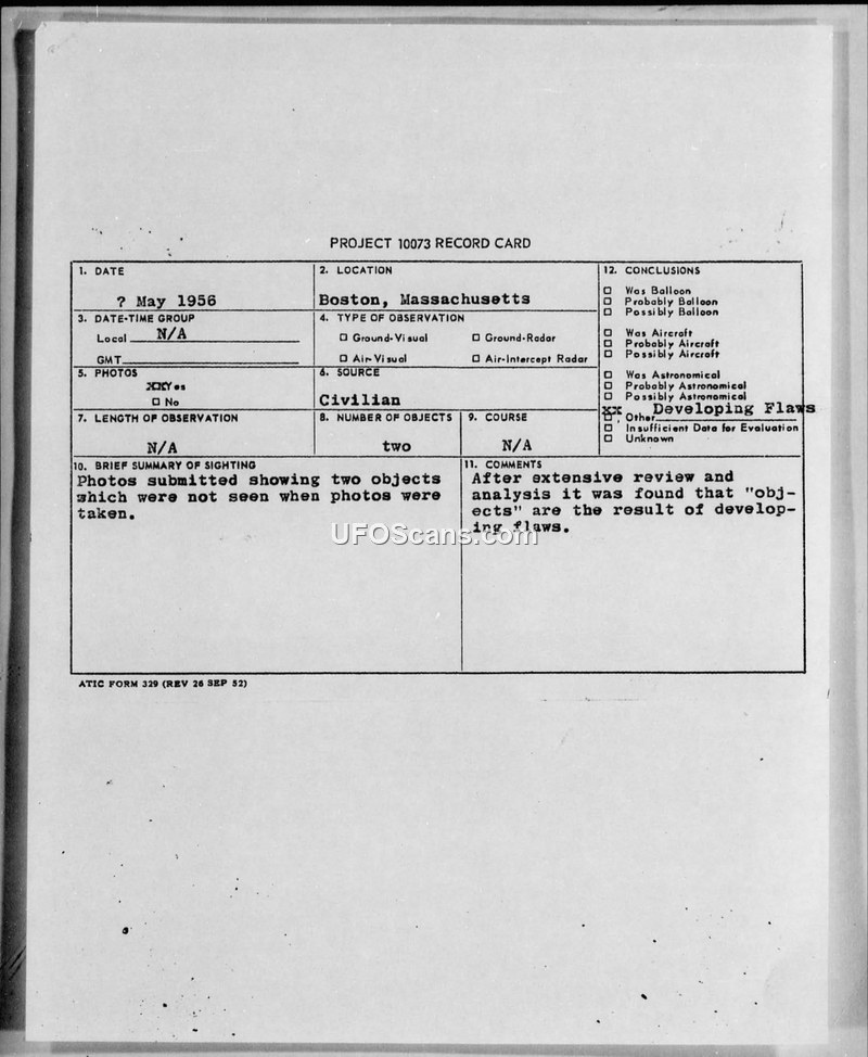 A 1956 UFO sighting in Boston was investigated by the Air Force and determined to be caused by photographic developing flaws. The report includes correspondence between the Air Force Cambridge Research Center and the Air Technical Intelligence Center.