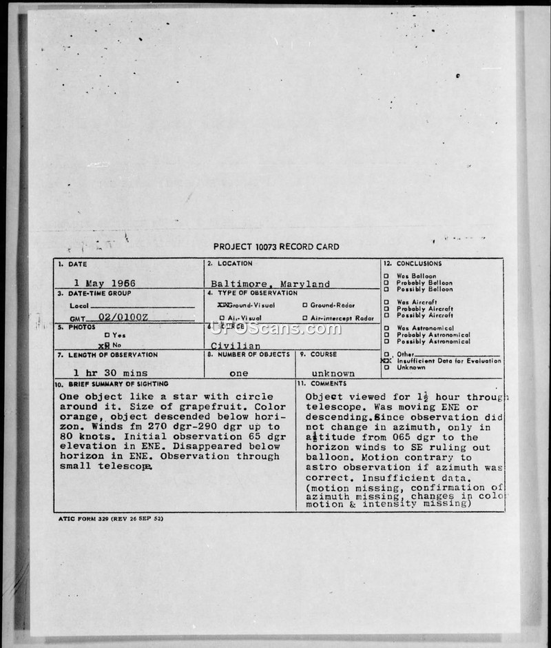 A civilian in Baltimore reported a 90-minute sighting of an orange, star-like object through a telescope on May 1, 1966. The military investigation concluded the case as 'Insufficient Data for Evaluation' due to missing critical observational details.