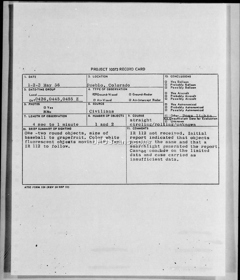 This document collection contains Project 10073 record cards and associated teletype communications regarding a series of unidentified aerial phenomena sightings in Pueblo, Colorado, during May 1956. The initial reports, occurring between May 1 and May 7, 1956, involved sightings by civilians and the Ground Observer Corps of one or two round, white, fluorescent objects described as moving very fast. These objects were estimated to be the size of a baseball to a grapefruit. Intelligence Sergeant Gilbert Neison of the 4602d Air Intelligence Service Squadron was dispatched to investigate these reports. His findings suggested that the objects were dull, fluorescent, and mostly triangular in shape, though some were round. The sightings were reported to last between four seconds and one minute. The official conclusion for these early May incidents was that there was insufficient data for a definitive evaluation, with some speculation that searchlights may have contributed to the reports. A subsequent report dated May 18, 1956, details a sighting at the Pueblo Ordinance Depot. In this instance, guards observed a single, stationary, transparent object shaped like an inverted bowling pin, estimated to be 50 to 80 feet in size. This specific incident was investigated by SSGT Serudder of the 4602d AISS, who determined through a routine check of local agencies that the object was a weather balloon, identified as balloon number S262, which had been released from Vernallis, California. The documents include various teletype messages confirming these investigations and the administrative handling of the reports under Air Force regulations.