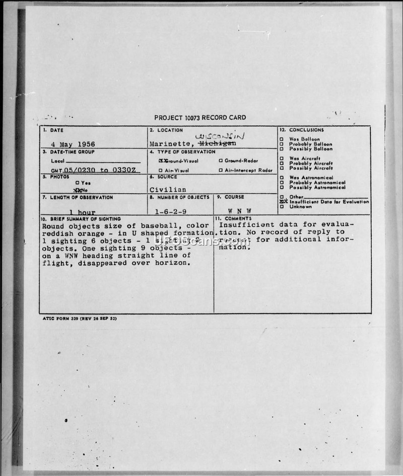 A clergyman and amateur astronomer reported multiple groups of reddish-orange objects in U-shaped formations over Marinette, Wisconsin, in May 1956. While the local Air Force unit initially suggested meteors, the Air Technical Intelligence Center rejected this, noting that such formations are not characteristic of meteoric phenomena.