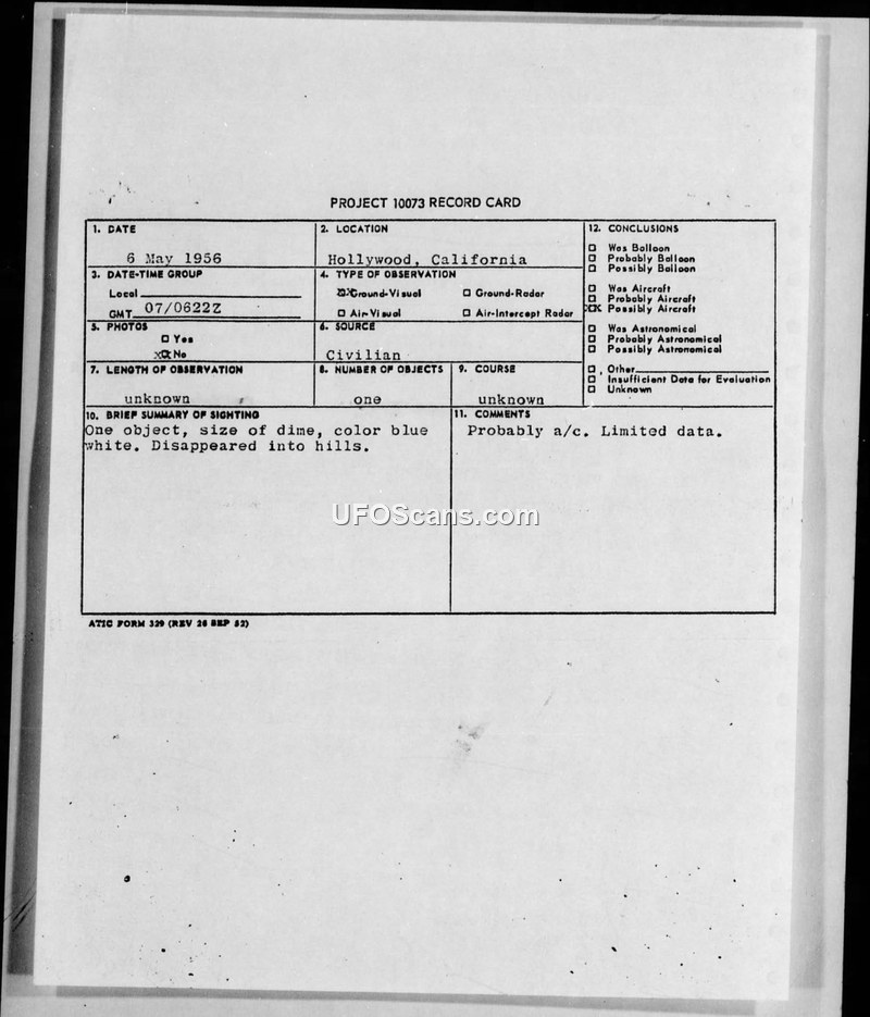Project 10073 Record Card — Hollywood, California, 6 May 1956