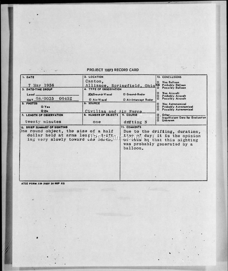 Project 10073 Record Card: Sighting in Canton, Alliance, Springfield, Ohio, 7 May 1956