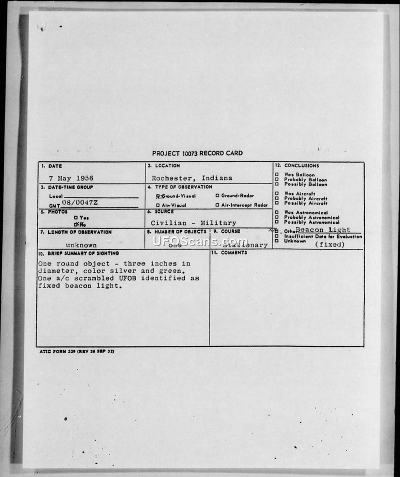 Project 10073 Record Card — Rochester, Indiana, 7 May 1956