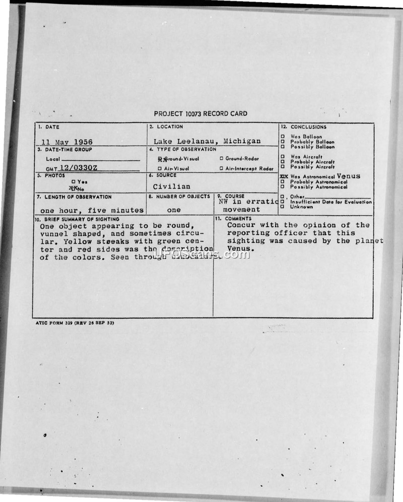 Project 10073 Record Card — Lake Leelanau, Michigan, 12 May 1956